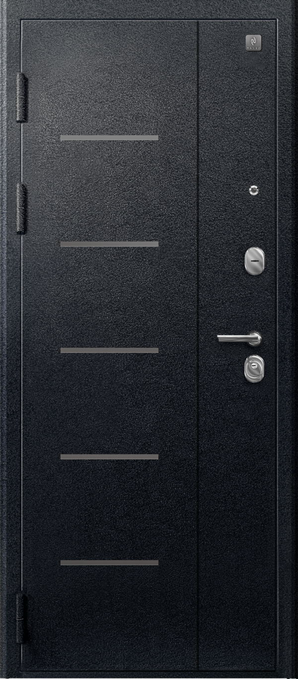Броненакладка на цилиндр, цилиндр — ключ/вертушка*, ночная задвижка, ручка раздельная, 3 петли, глазок, противосъемные штыри