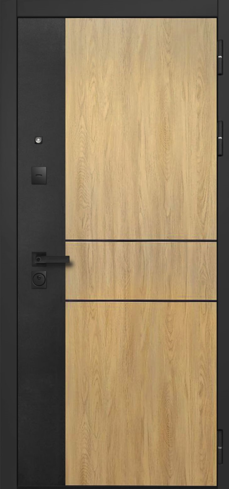 Внешнее покрытие: МДФ-панель 10 мм, цвет пленки: дуб мадейра янтарь. Наличники: сатин черный