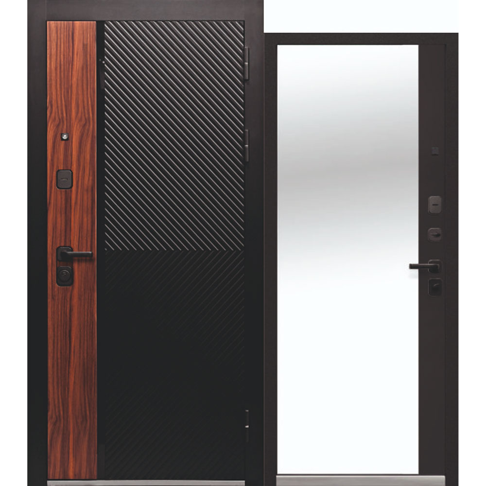 Внешнее покрытие: составная фрезерованная МДФ-панель 12 мм, цвет пленки «Орех Каньон Коньяк», наличники «Сатин черный». Вставка из черного стекла