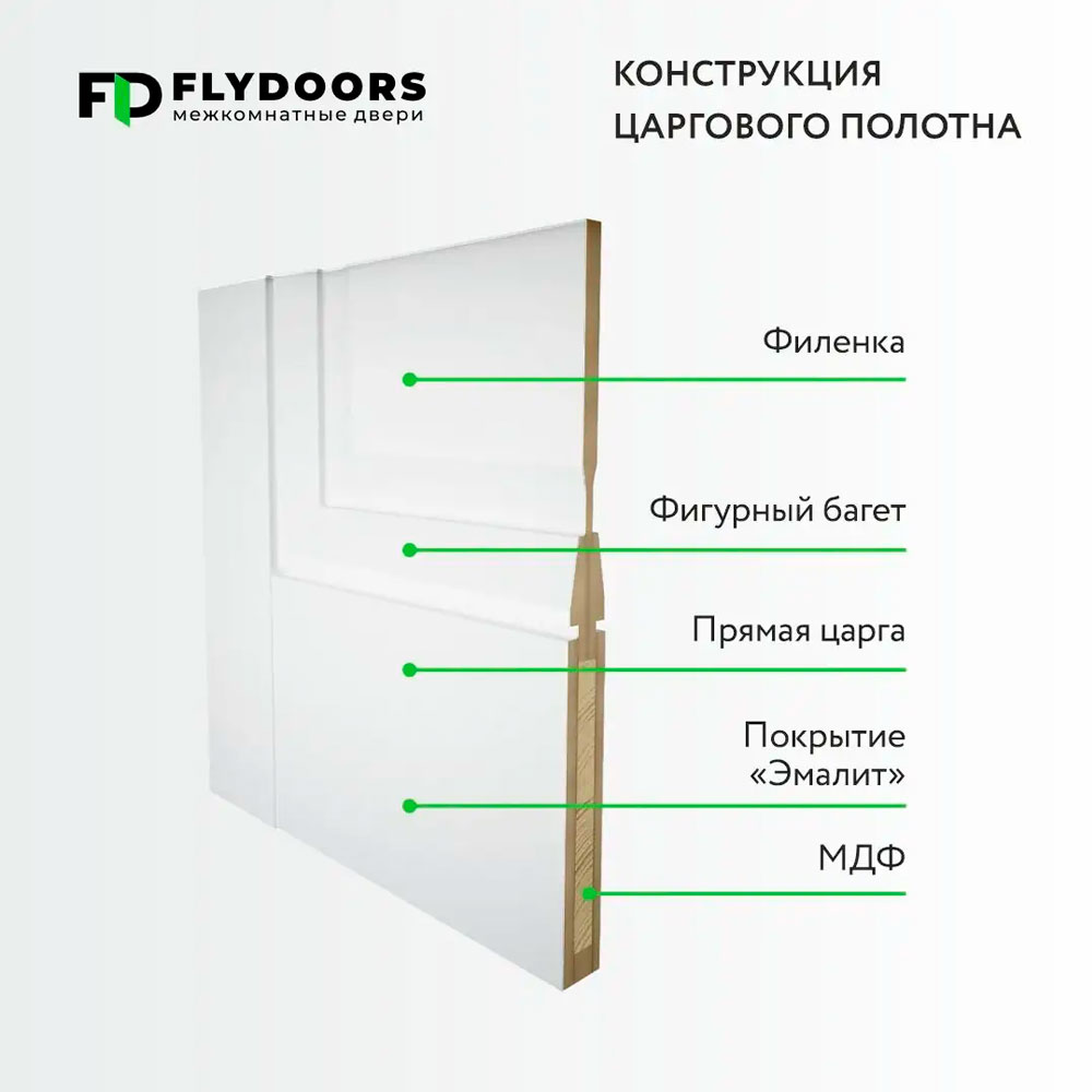 Конструкция полотна: Царговая. Выполнена на основе высококачественного соснового бруса и МДФ по бескромочной технологии. Модель с современным компланарным багетом и объемной филенкой.