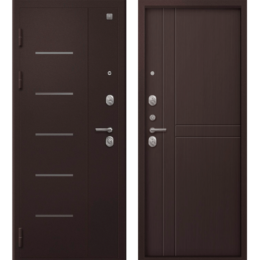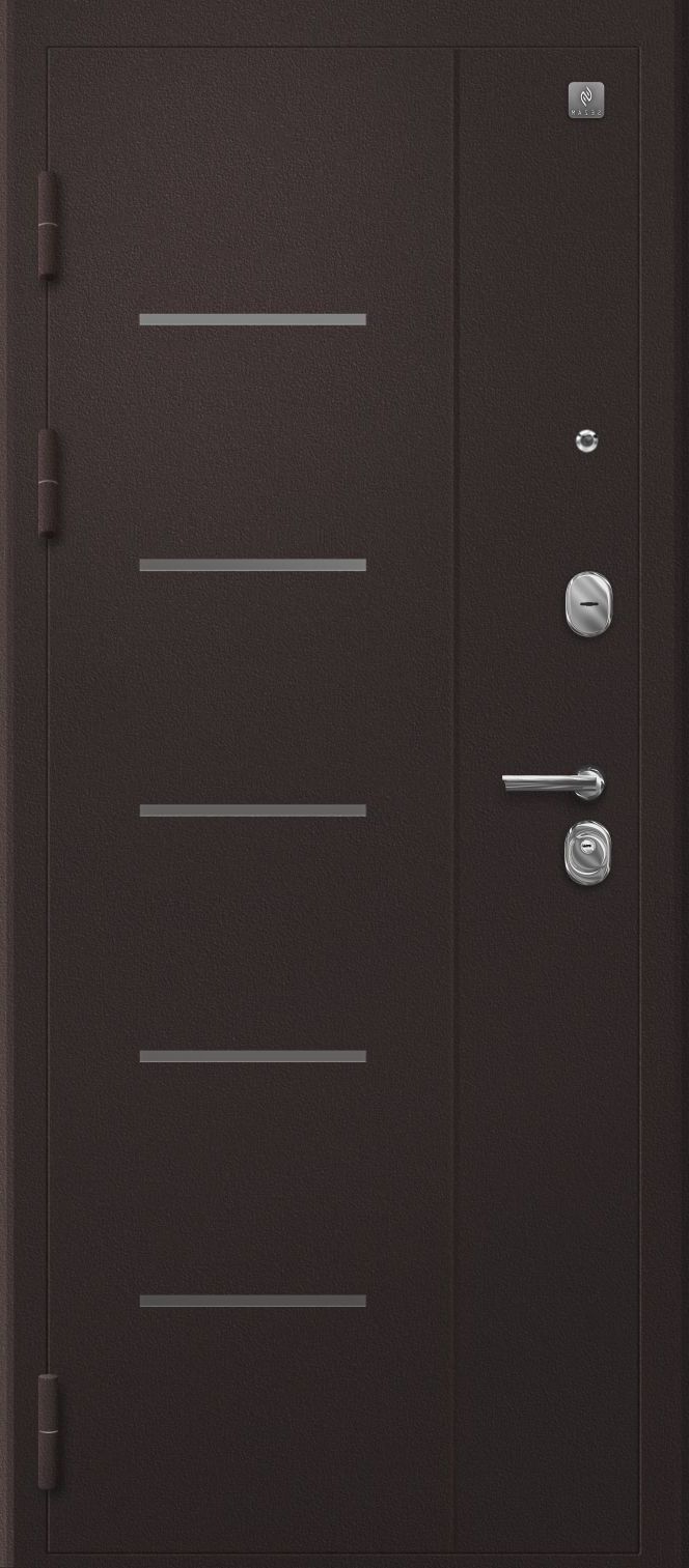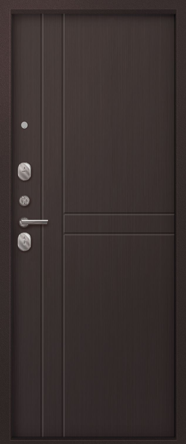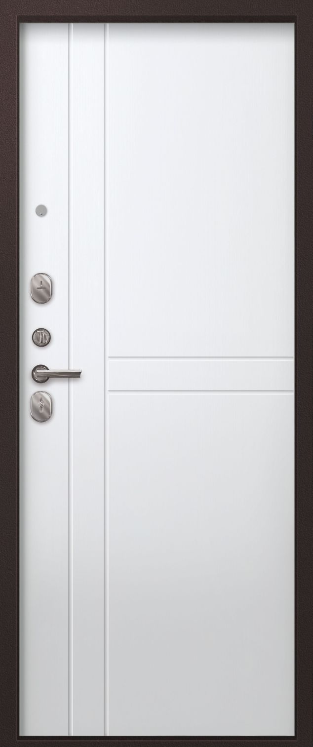Броненакладка на цилиндр, цилиндр — ключ/вертушка*, ночная задвижка, ручка раздельная, 3 петли, глазок, противосъемные штыри
