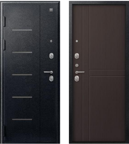 Броненакладка на цилиндр, цилиндр — ключ/вертушка*, ночная задвижка, ручка раздельная, 3 петли, глазок, противосъемные штыри