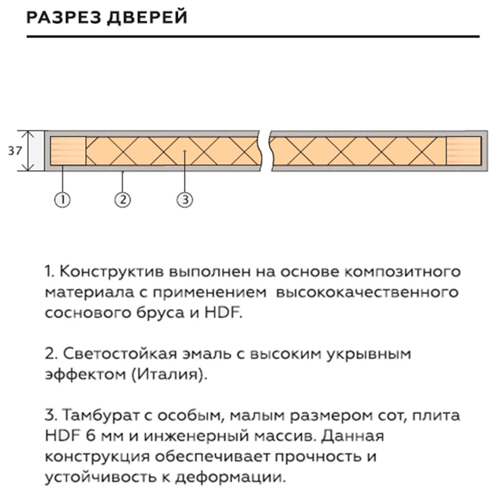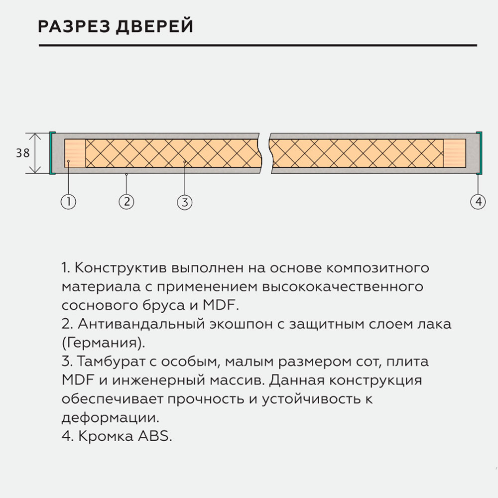 Тип конструкции: Каркасно-щитовая. Тамбурат с особым, малым размером сот. В основе плита HDF 6 мм и инженерный массив.